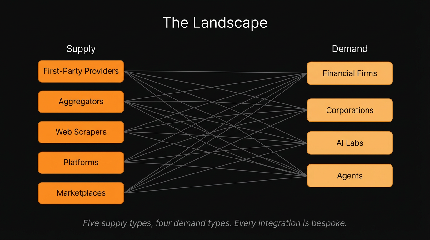 The information services industry, which is comprised of data aggregators, brokers, and data-as-a-service providers, is a $200B+ market that still operates the way it did twenty years ago. When a corporation, hedge fund, or AI lab wants to acquire data, they enter into bilateral negotiations that span search, integration, contracting, licensing, cost negotiation, and quality evaluation. Each deal forces n × m wiring between sources and endpoints. Engineers build bespoke ingestion pipelines. Researchers and quants validate data quality and backtest. Legal teams review agreements. A typical enterprise data procurement cycle can take three to six months from initial discovery to production integration, with legal review alone consuming four to eight weeks (that's assuming there is even a market for the data being sold!).