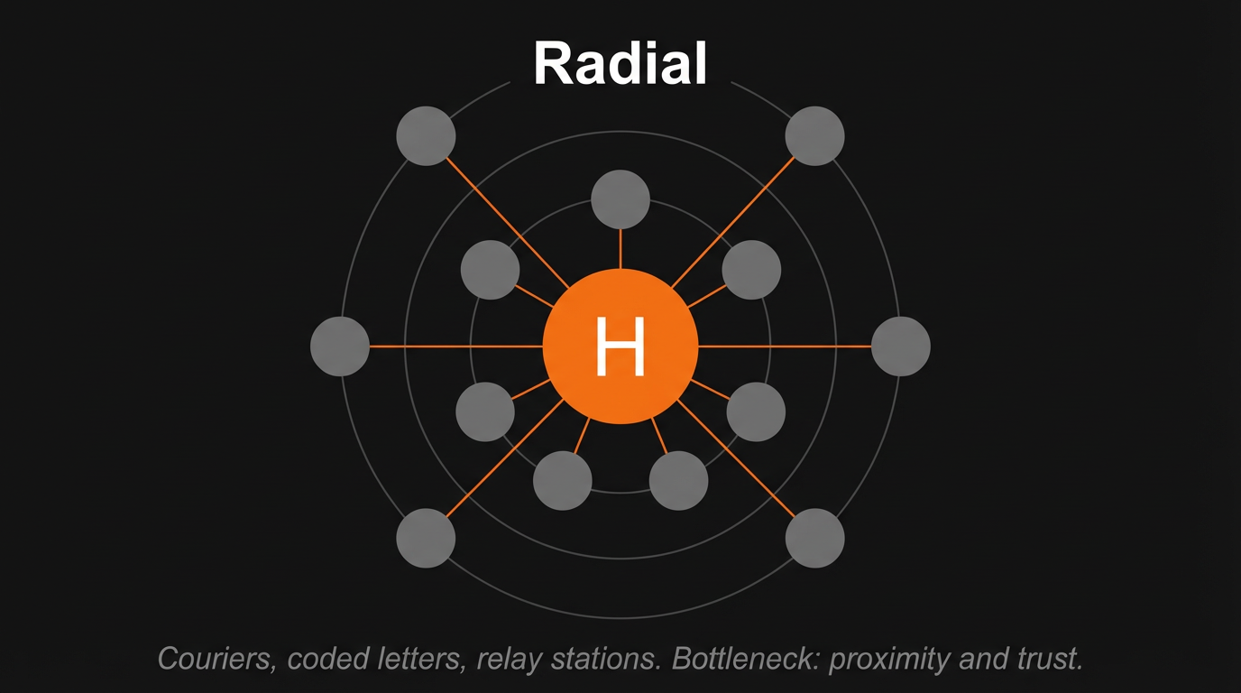 Before electronic communication, information moved at the speed of horses, ships, and pigeons. The geometry was radial, with merchant dynasties and banking houses at the center and their agents, couriers, and correspondents forming the spokes. The Rothschild family is the canonical example. Five brothers stationed across London, Paris, Frankfurt, Vienna, and Naples maintained a private courier network that transmitted commercial intelligence across Europe through coded letters and relay stations. The legend of Nathan Mayer Rothschild exploiting advance news of Waterloo in June 1815 to profit on British consols has become financial folklore's founding myth, though the historical record is more nuanced than the story suggests. What is indisputable is that the Rothschilds' information network was a genuine strategic asset, one built on physical speed and trusted intermediaries. The bottleneck in this era was proximity and trust. Information degraded with distance and time, and the intermediaries who thrived were those who could compress geography through speed and reduce uncertainty through reputation.