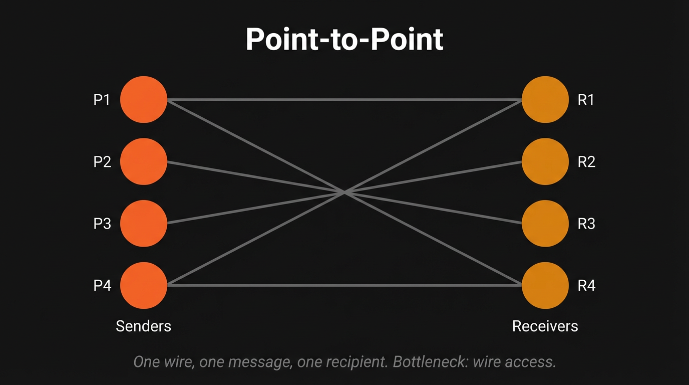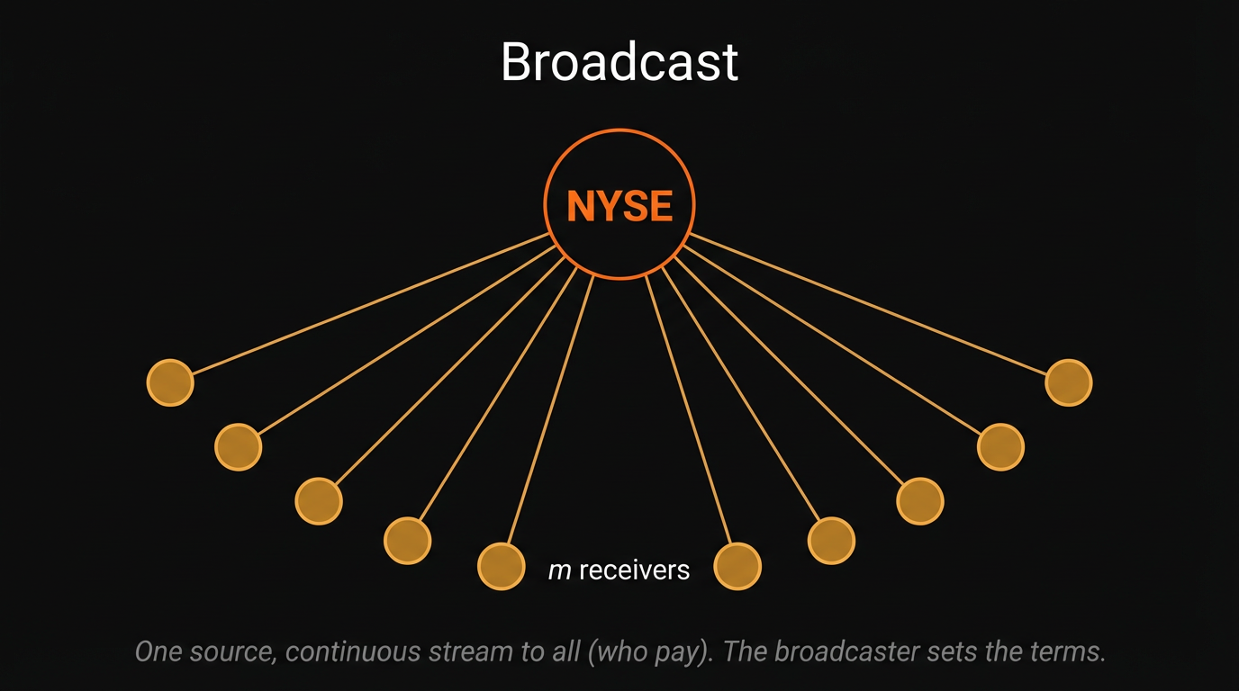 Broadcast geometry democratized access but concentrated control at the source. The exchange became the single point from which all data radiated. Anyone could receive the broadcast, but the broadcaster set the terms.