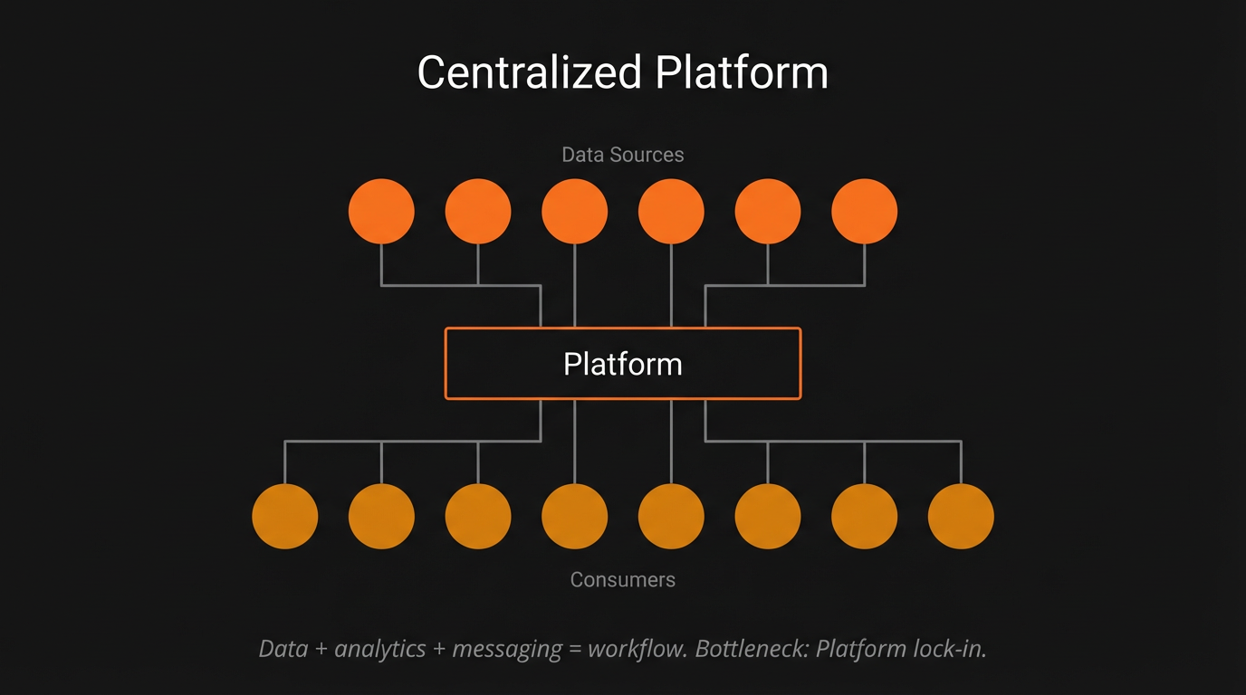 Hayek, too, finds his answer here. The most valuable data is knowledge of the particular circumstances of time and place, inherently dispersed, contextual, and resistant to centralization. A multiplexer with agents underneath does not attempt to centralize this knowledge into a catalog. It leaves it distributed and provides the routing intelligence to connect the right piece of dispersed knowledge to the right consumer at the right moment. The geometry is not hub-and-spoke. It is mesh.