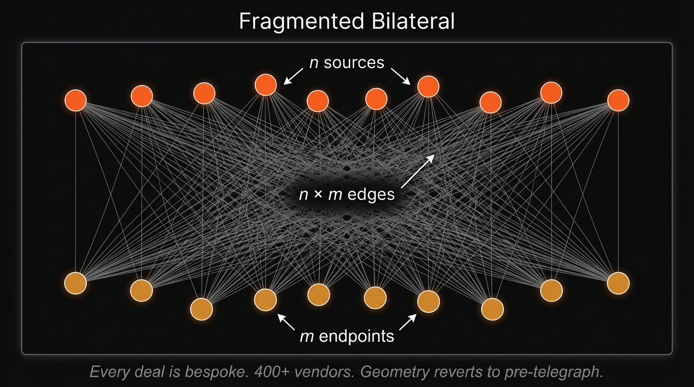 And this is where Grossman-Stiglitz becomes not a warning but a design principle. The paradox tells us that transparent marketplaces destroy the incentive to gather information at the frontier. The multiplexer respects this constraint by design. Agent-to-agent transactions are bilateral, private, and non-leaking. A hedge fund's procurement activity is not visible to its competitors. A first-party data provider's customer list is not exposed to the market. The geometry preserves the opacity that frontier buyers demand while still collapsing the coordination costs that make the current market so inefficient. The infrastructure makes data liquid without making it public.