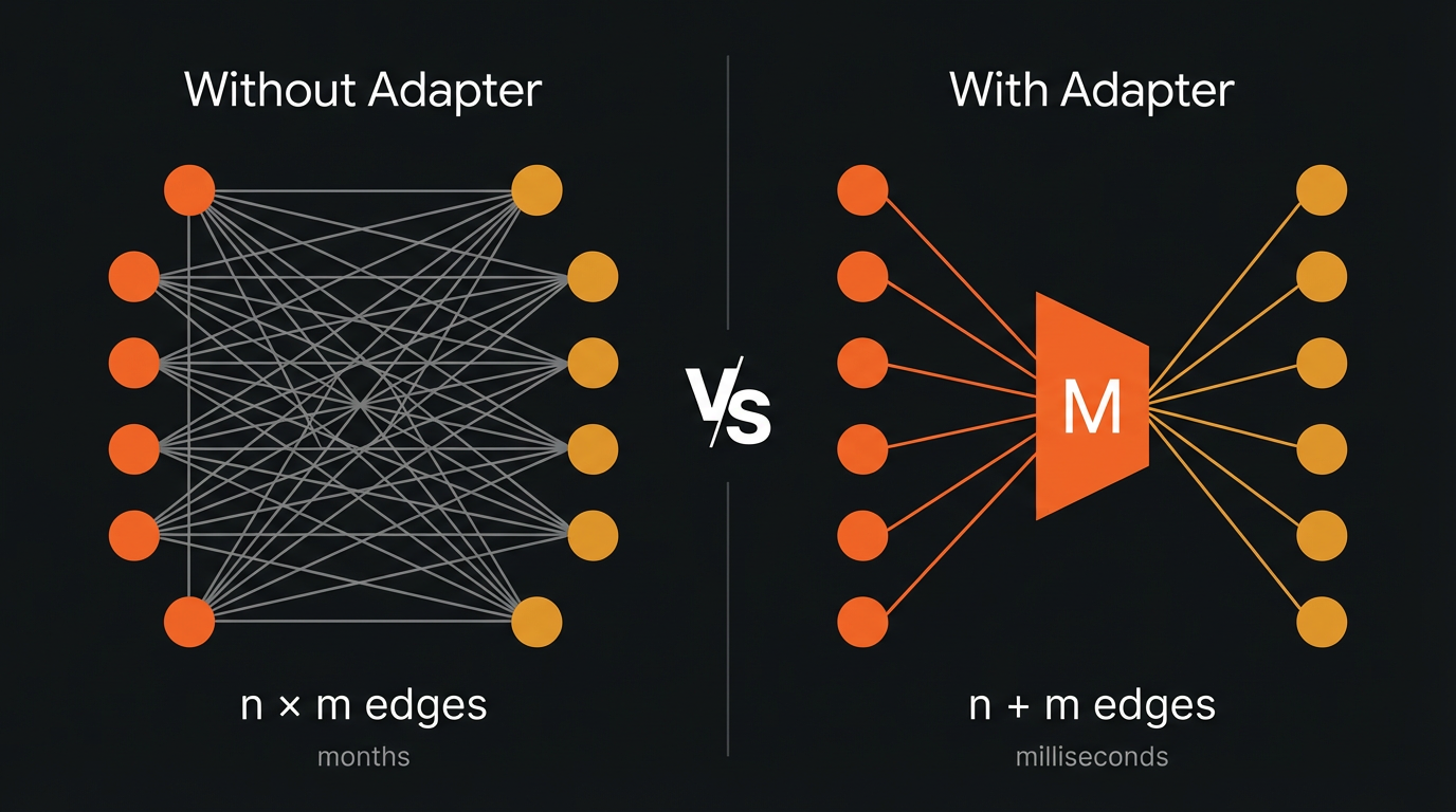 A multiplexer, as we think about it, collapses n × m bilateral connections into n + m. Instead of every buyer building a bespoke integration with every supplier, each source connects once to an adapter layer, and each endpoint connects once to that same layer. The adapter handles the work that currently consumes months and tens of thousands of dollars per deal: schema negotiation, format alignment, quality validation, licensing, delivery. Sources publish their capabilities. Endpoints describe their requirements. The multiplexer performs the matching, evaluation, and integration that a marketplace cannot.